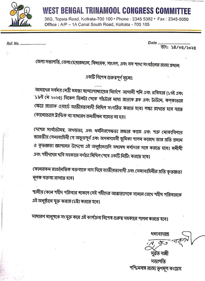 আগামী শনি ও রবিবার তৃণমূল নেতৃত্বের নির্দেশে এক বিশেষ কর্মসূচি নেওয়া হয়েছে। প্রত্যেকটি ওয়ার্ডে বীর শহীদ ও মণীষীদের ছবি সহযোগে হবে বর্ণাঢ্য মিছিল। মিছিল শেষে সভার মাধ্যমে সমাপ্ত হবে এই অনুষ্ঠান। মূলত ভারতের অখন্ডতা, সার্বভৌমত্ব রক্ষায় শত্রুদের বিরুদ্ধে দেশকে রক্ষা করার জন্য দেশের সেনাবাহিনীর প্রতি শ্রদ্ধা জানানো হবে তৃণমূল কংগ্রেসের পক্ষ থেকে।