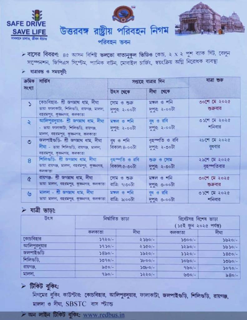 বাসের রুট: ফালাকাটা, শিলিগুড়ি, রায়গঞ্জ, মালদা, বহরমপুর, কৃষ্ণনগর, কলকাতা, কোলাঘাট হয়ে দিঘার জগন্নাথধামে পৌঁছবে বাস।