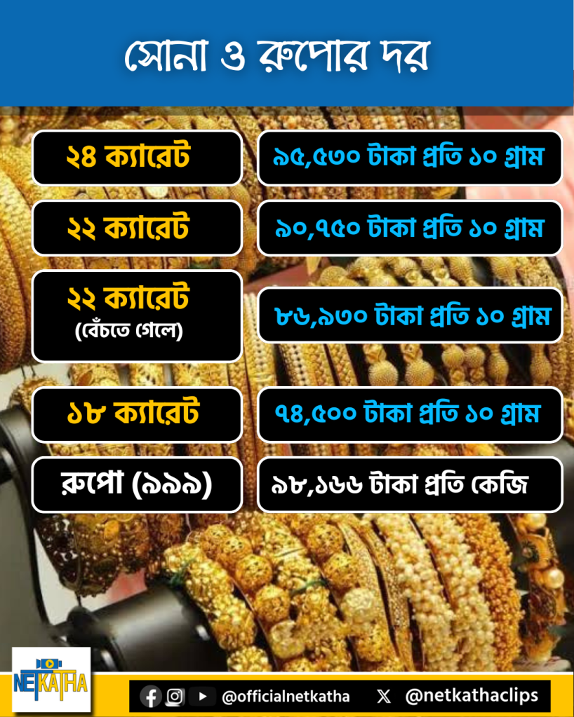 আজ ২৪ ক্যারেট ১০ গ্রাম সোনার দাম রয়েছে ৯৫,৫৩০ টাকা, ৯০,৭৫০ টাকা দাম রয়েছে ২২ ক্যারেট সোনার দাম, ২২ ক্যারেট সোনা বিক্রি করতে গেলে তার দাম রয়েছে প্রতি ১০ গ্রামের জন্য ৮৬,৯৩০ টাকা, ১৮ ক্যারেট সোনার দাম ৭৪,৫০০ টাকা প্রতি ১০ গ্রাম, এক কেজি বিশুদ্ধ চাঁদি (৯৯.৯) -র দাম ৯৮,১৬৬ টাকা।