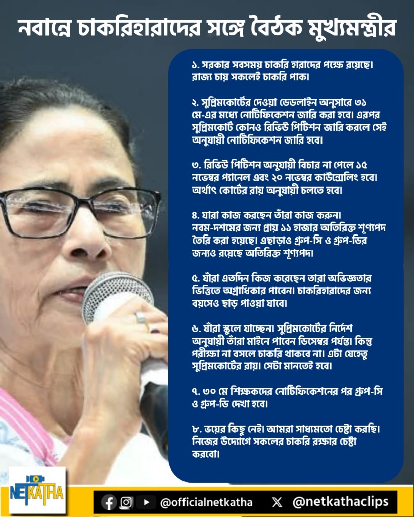 চাকরিহারাদের সঙ্গে আজ বিকেলে নবান্নে বৈঠক করেন মমতা বন্দ্যোপাধ্যায়। সেখানে তিনি জানান, আগামী ৩০ মে চাকরির বিজ্ঞপ্তি জারি করা হবে। আবেদনের শেষ তারিখ ১৪ জুলাই। পরে রিভিউ পিটিশন যা নির্দেশ হবে সেই অনুযায়ী নির্দেশিকা বদলানো হবে। সুপ্রিম কোর্টের নির্দেশ মেনেই নোটিফিকেশন আসবে ৩১ মে-এর মধ্যে।
