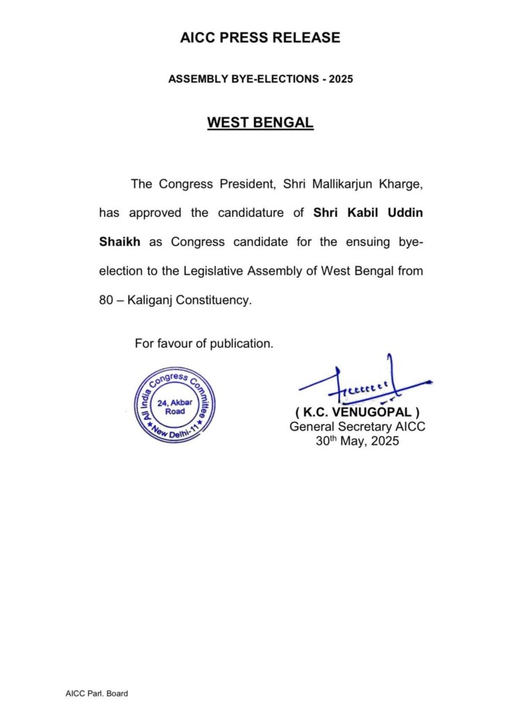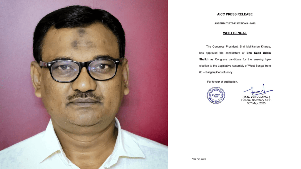 কাবিল উদ্দিন শেখ-কে বিধানসভা উপনির্বাচনে টিকিট দিল কংগ্রেস। AICC -র সাধারণ সম্পাদক কে সি ভেনুগোপাল জানান কংগ্রেসের হয়ে লড়বেন সংখ্যালঘু প্রার্থী কাফিল উদ্দিন শেখ।